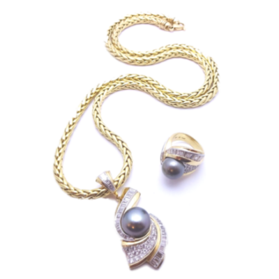 Amazing Tahitian Pearl and Diamond Platinum 18K Necklace and Ring Set