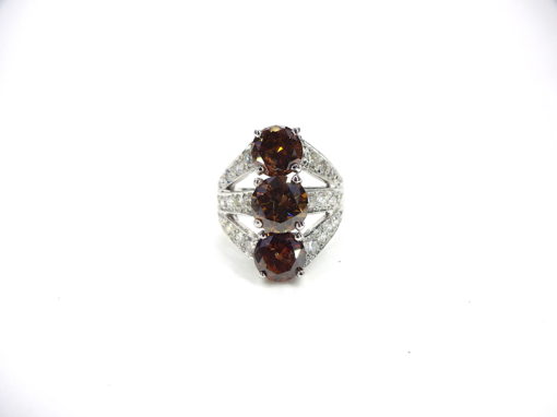 Center Stones: 1.44 Ct I1 Dark Yellow Brown Diamond, 1.14 Ct I3 Fancy Yellow Brown Diamond, 1.05 Ct I1 Fancy Yellow Brown Diamond